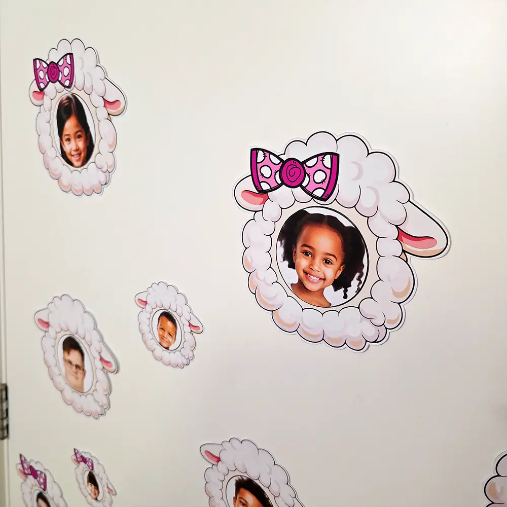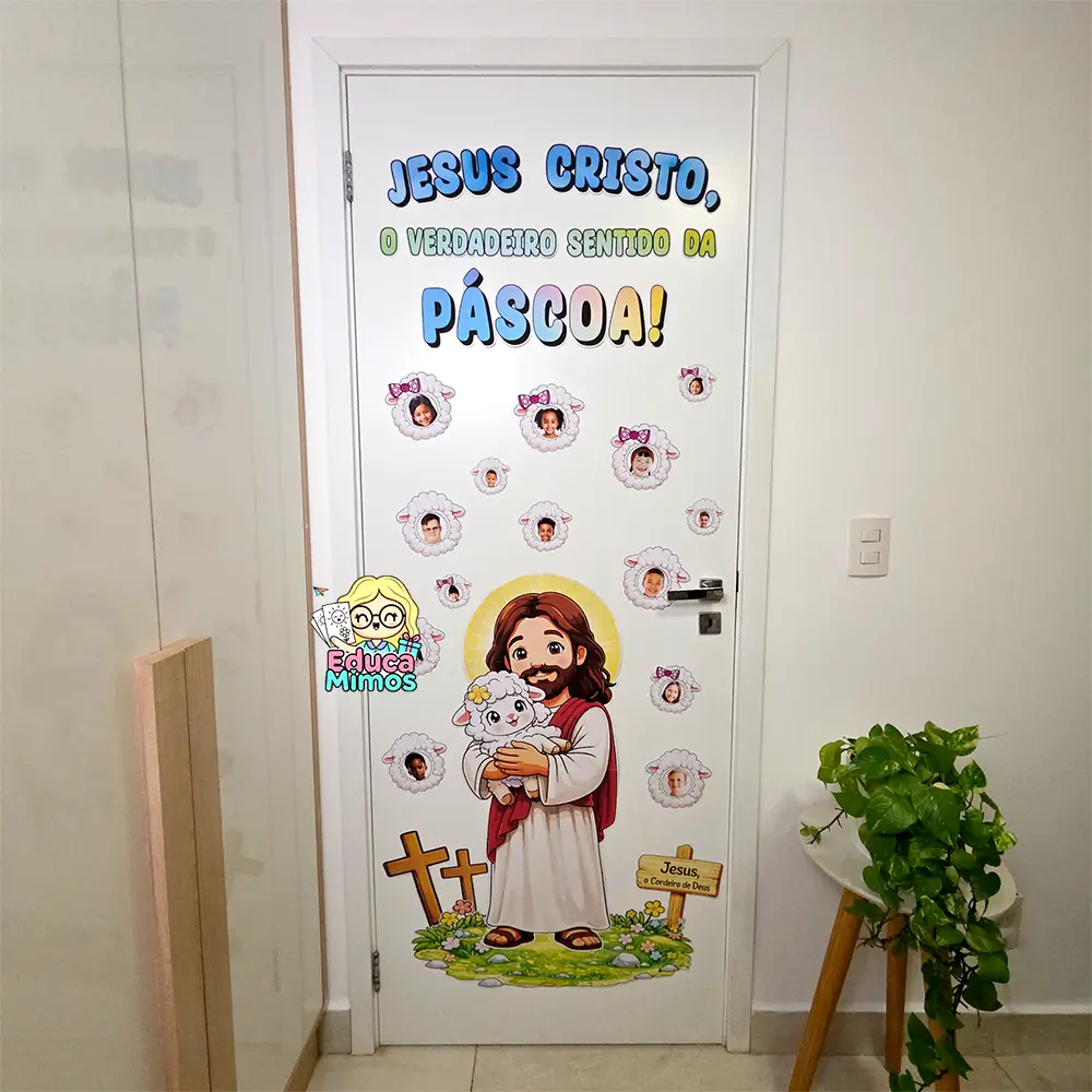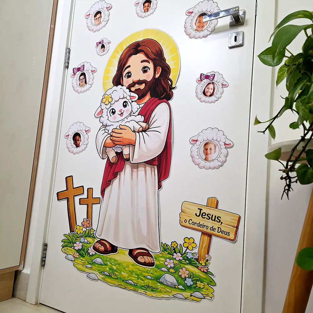 Você pode adicionar as fotos dos alunos/crianças nos cordeirinhos para fazer parte do painel, tornando a decoração única, afetiva e muito mais envolvente! 💖