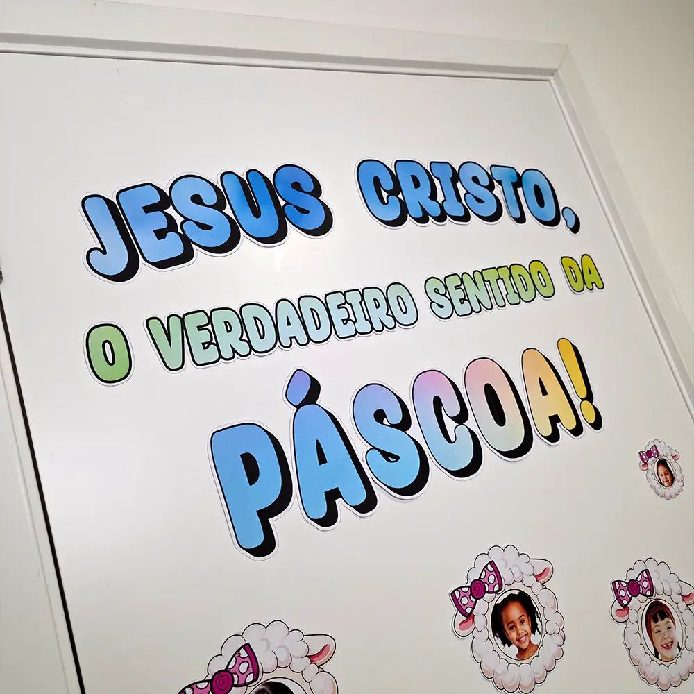 Este painel foi desenvolvido para lembrar que a verdadeira Páscoa está no amor de Jesus Cristo — de forma visual, delicada e especial para as crianças. ✝️